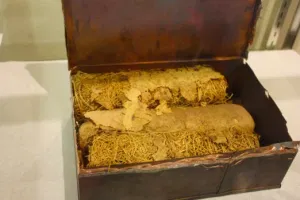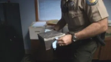 State Parks employees chose not to peek before the public unveiling. A Dremel tool was used to cut through three sides of the lid, and the fourth side was removed while the public watched. When the lid was pulled back, people saw three rolls of fiber and paper. All three were damaged by age.